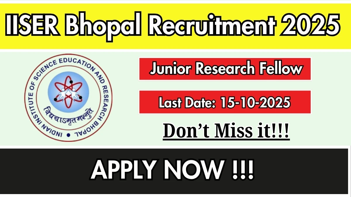 Indian Institute of Science Education and Research Bhopal (IISER Bhopal) has released an official notification for the recruitment of 01 Junior Research Fellow Posts. Interested and eligible candidates can apply Offline through the official IISER Bhopal website. The last date to submit the application form is 15-10-2025. In this article, you’ll find the IISER Bhopal Junior Research Fellow Posts recruitment details, including eligibility criteria, age limit, salary structure, selection process, application steps, and direct links to the official notification and Offline application form.