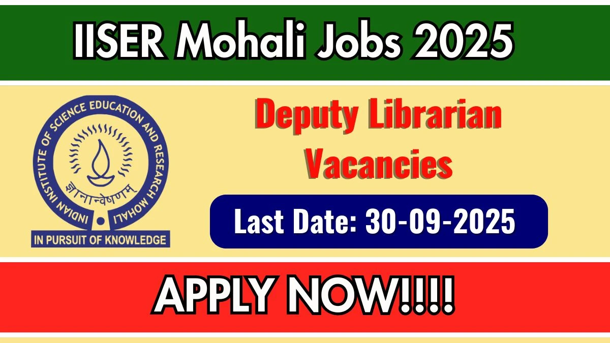 The Indian Institute of Science Education and Research Mohali (IISER Mohali) Recruitment 2025 for 01 posts of Deputy Librarian. Candidates with M.Phil/Ph.D, M.Lib Can Apply Online. The online application opens on 02-09-2025, and closes on 30-09-2025. The candidate shall apply online through IISER Mohali website, iisermohali.ac.in.