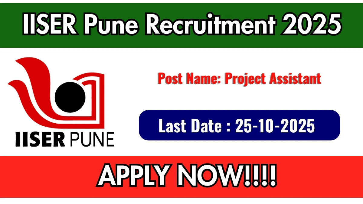 Indian Institute of Science Education and Research Pune (IISER Pune) has released an official notification for the recruitment of 01 Project Assistant Posts. Interested and eligible candidates can apply Offline through the official IISER Pune website. The last date to submit the application form is 25-10-2025. In this article, you’ll find the IISER Pune Project Assistant Posts recruitment details, including eligibility criteria, age limit, salary structure, selection process, application steps, and direct links to the official notification and Offline application form.