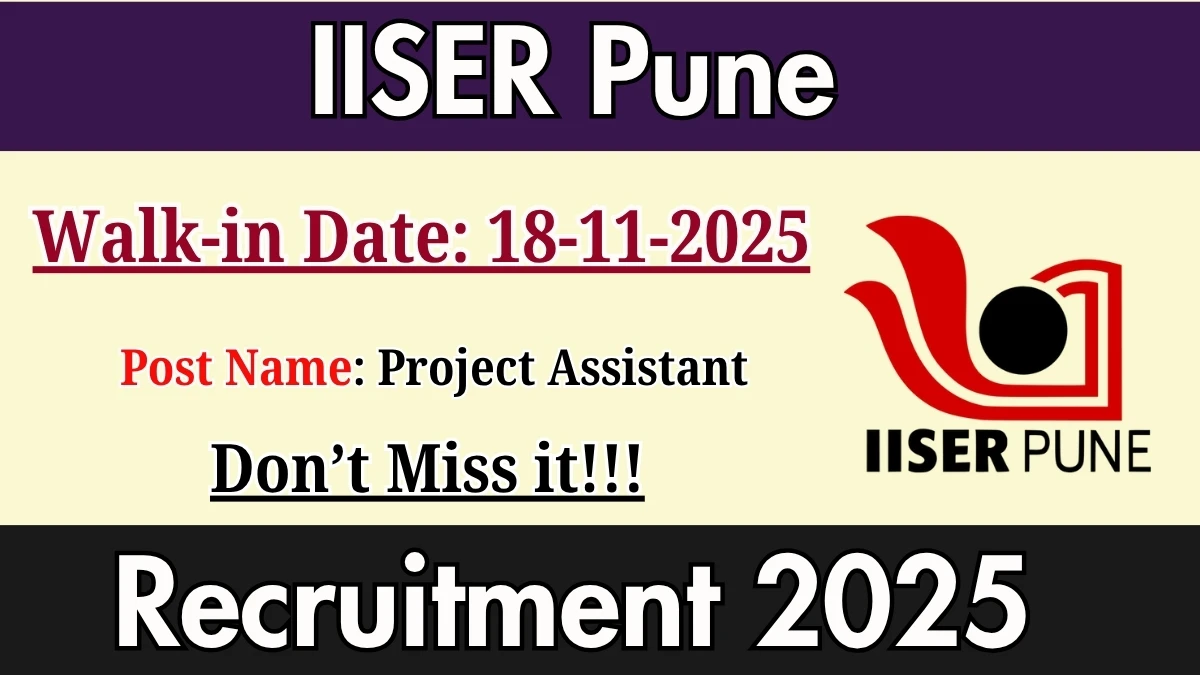 Indian Institute of Science Education and Research (IISER Pune) Recruitment 2025 for 01 posts of Project Assistant. Candidates with B.Tech/B.E, M.Sc Can attend the walkin. The Walk-in on 18-11-2025. For detailed information please visit IISER Pune official website, iiserpune.ac.in.
