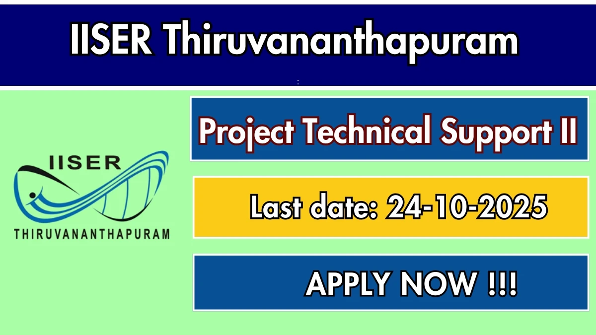 Indian Institute of Science Education and Research Thiruvananthapuram (IISER Thiruvananthapuram) has released an official notification for the recruitment of 01 Project Technical Support II Posts. Interested and eligible candidates can apply Online through the official IISER Thiruvananthapuram website. The last date to submit the application form is 24-10-2025. In this article, you’ll find the IISER Thiruvananthapuram Project Technical Support II Posts recruitment details, including eligibility criteria, age limit, salary structure, selection process, application steps, and direct links to the official notification and Online application form.
