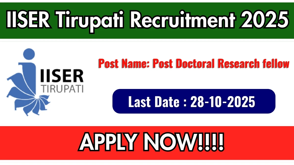 Indian Institute of Science Education and Research Tirupati (IISER Tirupati) has released an official notification for the recruitment of 02 Post Doctoral Research fellow Posts. Interested and eligible candidates can apply Offline through the official IISER Tirupati website. The last date to submit the application form is 28-10-2025. In this article, you’ll find the IISER Tirupati Post Doctoral Research fellow Posts recruitment details, including eligibility criteria, age limit, salary structure, selection process, application steps, and direct links to the official notification and Offline application form.