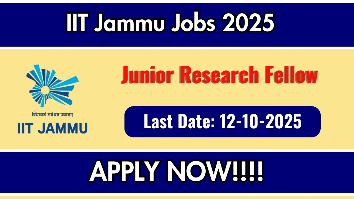 Indian Institute of Technology Jammu (IIT Jammu) has released an official notification for the recruitment of 01 Junior Research Fellow Posts. Interested and eligible candidates can apply Online through the official IIT Jammu website. The last date to submit the application form is 12-10-2025. In this article, you’ll find the IIT Jammu Junior Research Fellow Posts recruitment details, including eligibility criteria, age limit, salary structure, selection process, application steps, and direct links to the official notification and Online application form.