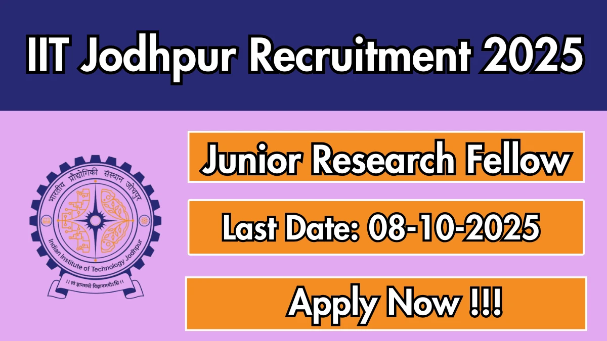 Indian Institute of Technology Jodhpur (IIT Jodhpur) has released an official notification for the recruitment of 01 Junior Research Fellow Posts. Interested and eligible candidates can apply Online through the official IIT Jodhpur website. The last date to submit the application form is 08-10-2025. In this article, you’ll find the IIT Jodhpur Junior Research Fellow Posts recruitment details, including eligibility criteria, age limit, salary structure, selection process, application steps, and direct links to the official notification and Online application form.