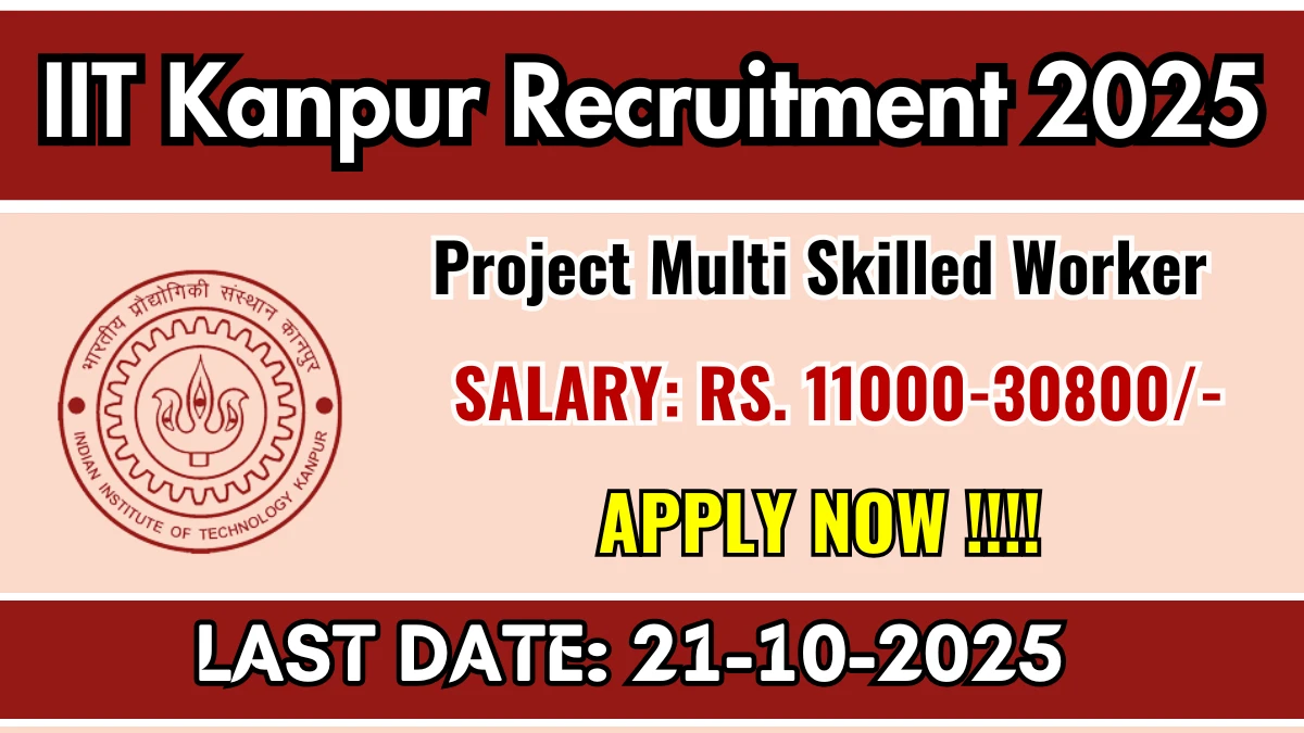 Indian Institute of Technology Kanpur (IIT Kanpur) has released an official notification for the recruitment of 01 Project Multi Skilled Worker Posts. Interested and eligible candidates can apply Online through the official IIT Kanpur website. The last date to submit the application form is 21-10-2025. In this article, you’ll find the IIT Kanpur Project Multi Skilled Worker Posts recruitment details, including eligibility criteria, age limit, salary structure, selection process, application steps, and direct links to the official notification and Online application form.