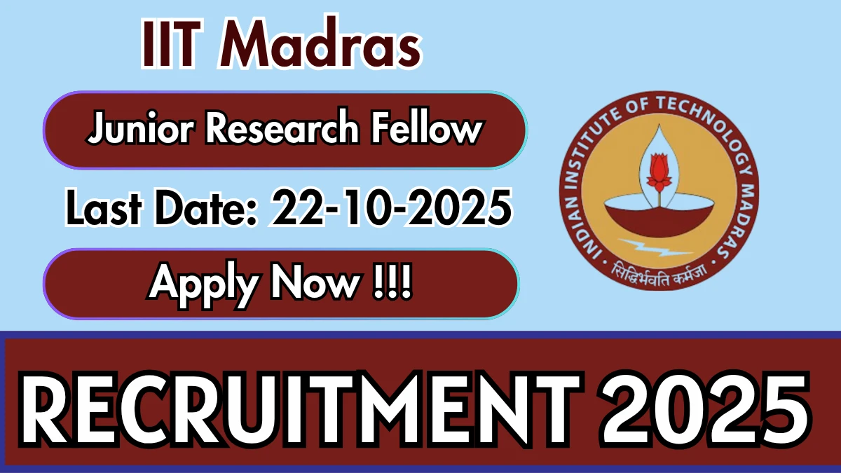 Indian Institute of Technology Madras (IIT Madras) has released an official notification for the recruitment of 01 Junior Research Fellow Posts. Interested and eligible candidates can apply Online through the official IIT Madras website. The last date to submit the application form is 22-10-2025. In this article, you’ll find the IIT Madras Junior Research Fellow Posts recruitment details, including eligibility criteria, age limit, salary structure, selection process, application steps, and direct links to the official notification and Online application form.