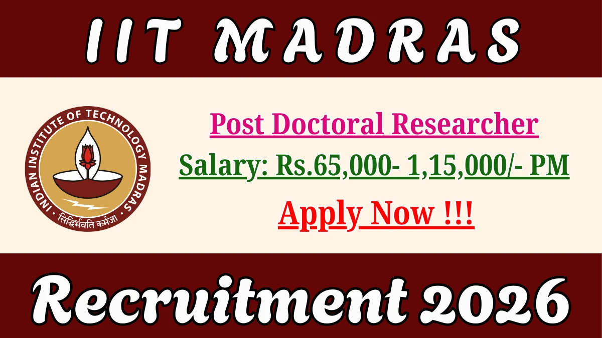 Indian Institute of Technology Madras (IIT Madras) has released an official notification for the recruitment of 01 Post Doctoral Researcher Posts. Interested and eligible candidates can apply Online through the official IIT Madras website. The last date to submit the application form is 16-02-2026. In this article, you’ll find the IIT Madras Post Doctoral Researcher Posts recruitment details, including eligibility criteria, age limit, salary structure, selection process, application steps, and direct links to the official notification and Online application form.