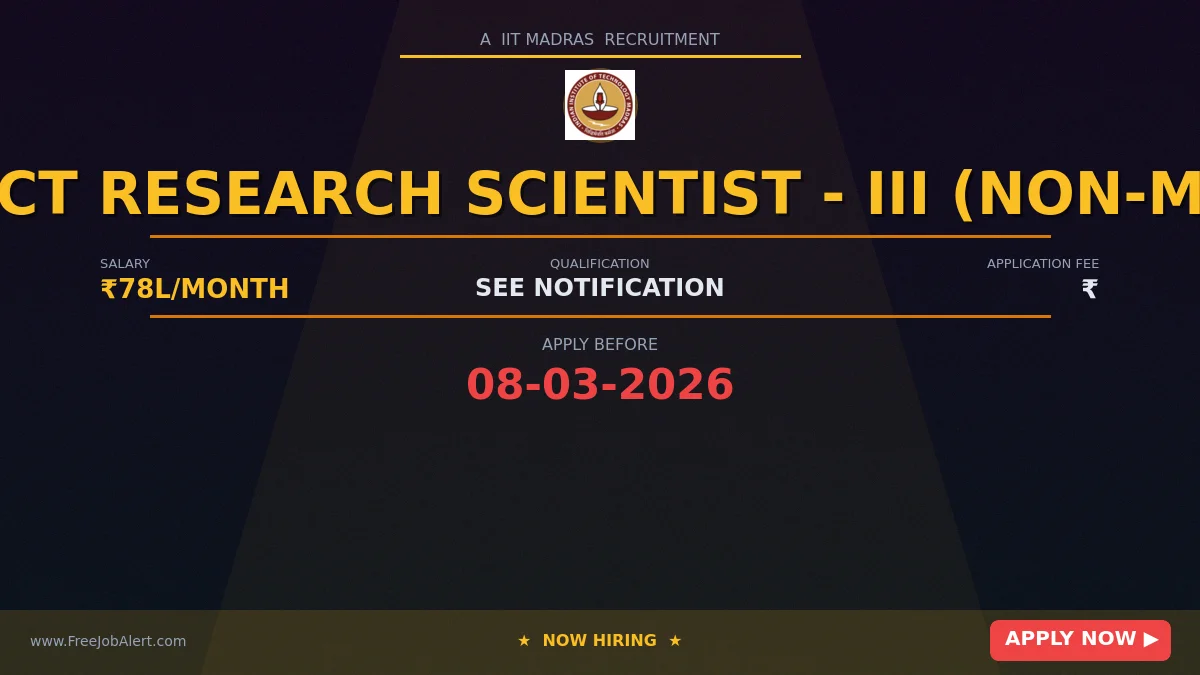 Indian Institute of Technology Madras (IIT Madras) Recruitment 2026: Indian Institute of Technology Madras has released the official notification for 1 Project Research Scientist - III (Non-Medical) posts, inviting applications from eligible candidates in Tamil Nadu. This recruitment provides an excellent opportunity for candidates seeking stable and well-paid research jobs.