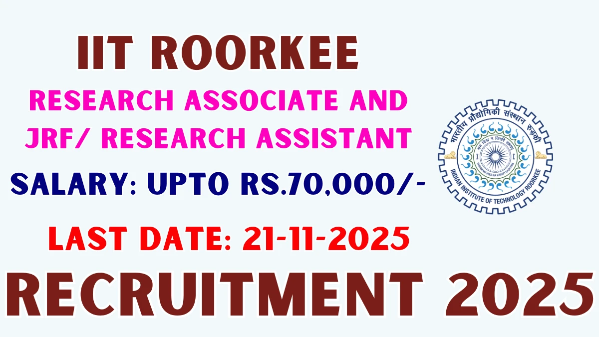Indian Institute of Technology Roorkee (IIT Roorkee) has released an official notification for the recruitment of 02 Research Associate and JRF/ Research Assistant Posts. Interested and eligible candidates can apply Offline through the official IIT Roorkee website. The last date to submit the application form is 21-10-2025. In this article, you’ll find the IIT Roorkee Research Associate and JRF/ Research Assistant Posts recruitment details, including eligibility criteria, age limit, salary structure, selection process, application steps, and direct links to the official notification and Offline application form.