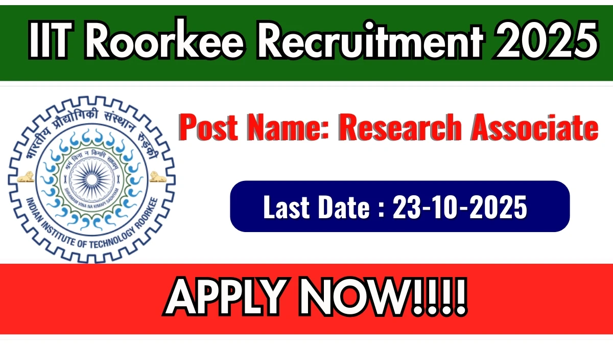 Indian Institute Of Technology Roorkee (IIT Roorkee) has released an official notification for the recruitment of 01 Research Associate Posts. Interested and eligible candidates can apply Offline through the official IIT Roorkee website. The last date to submit the application form is 23-10-2025. In this article, you’ll find the IIT Roorkee Research Associate Posts recruitment details, including eligibility criteria, age limit, salary structure, selection process, application steps, and direct links to the official notification and Offline application form.