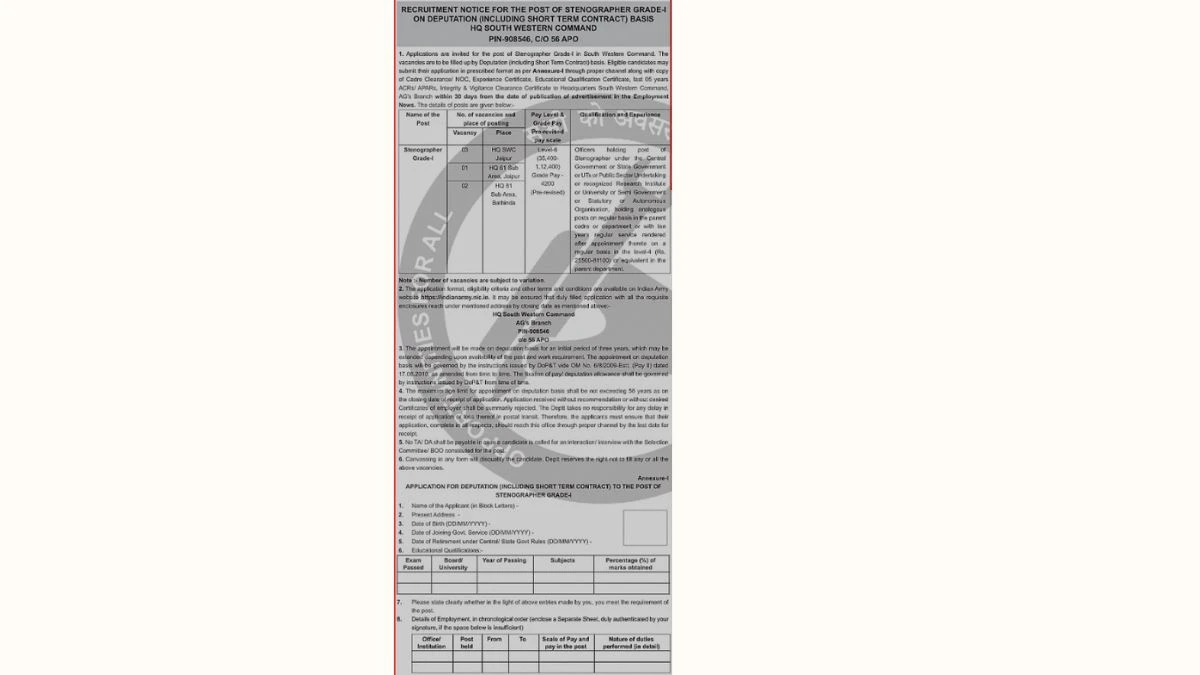 Indian Army (South Western Command) has released an official notification for the recruitment of 6 Stenographer Grade I Posts. Interested and eligible candidates can apply Offline through the official Indian Army website. The last date to submit the application form is 22-12-2025. In this article, you’ll find the Indian Army Stenographer Grade I Posts recruitment details, including eligibility criteria, age limit, salary structure, selection process, application steps, and direct links to the official notification and Offline application form.