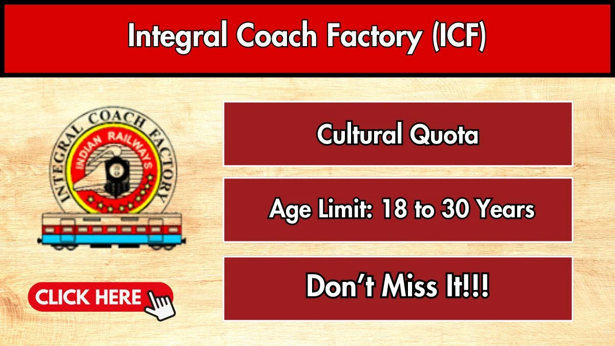 Integral Coach Factory (ICF) has released an official notification for the recruitment of 02 Cultural Quota Posts. Interested and eligible candidates can apply Online through the official ICF website. The last date to submit the application form is 28-02-2026. In this article, you’ll find the ICF Cultural Quota Posts recruitment details, including eligibility criteria, age limit, salary structure, selection process, application steps, and direct links to the official notification and Online application form.