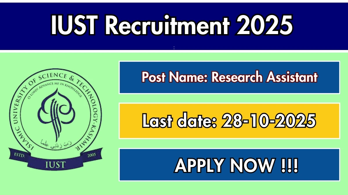 Islamic University of Science and Technology (IUST) has released an official notification for the recruitment of Research Assistant Posts. Interested and eligible candidates can apply Offline through the official IUST website. The last date to submit the application form is 28-10-2025. In this article, you’ll find the IUST Research Assistant Posts recruitment details, including eligibility criteria, age limit, salary structure, selection process, application steps, and direct links to the official notification and Offline application form.