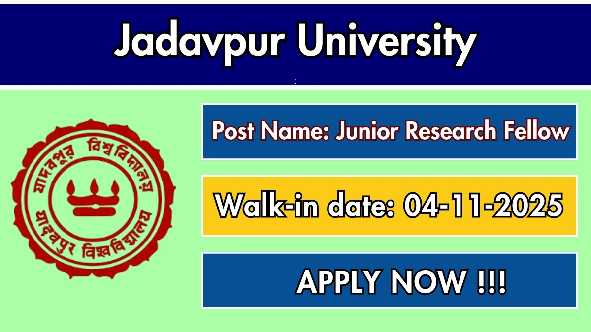 Jadavpur University Recruitment 2025 for 01 posts of Junior Research Fellow. Candidates with B.Sc, B.Tech/B.E, M.Sc, M.E/M.Tech Can attend the walkin. The Walk-in on 04-11-2025. For detailed information please visit Jadavpur University official website, jadavpuruniversity.in.