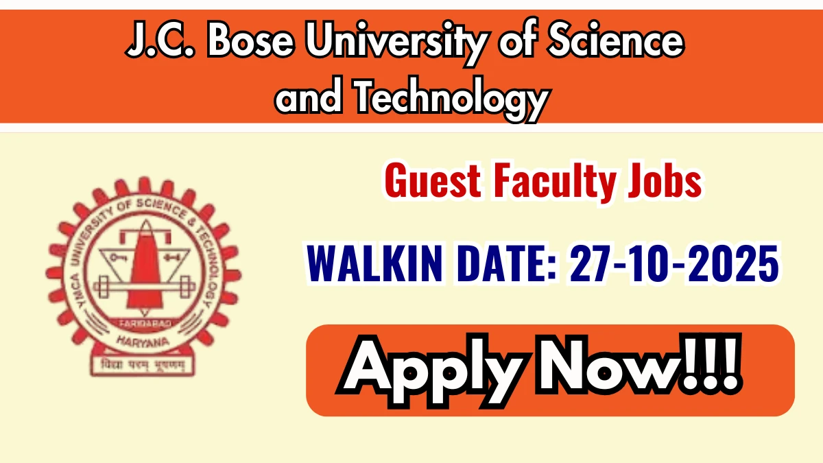J.C. Bose University of Science and Technology Recruitment 2025 for posts of Guest Faculty. Candidates with B.Tech/B.E Can attend the walkin. The Walk-in on 27-10-2025. For detailed information please visit J.C. Bose University of Science and Technology official website, jcboseust.ac.in.