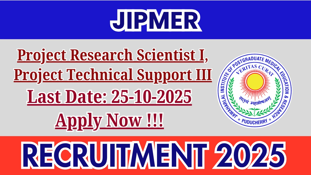 Jawaharlal Institute of Postgraduate Medical Education and Research (JIPMER) has released an official notification for the recruitment of 04 Project Research Scientist I, Project Technical Support III Posts. Interested and eligible candidates can apply Offline through the official JIPMER website. The last date to submit the application form is 25-10-2025. In this article, you’ll find the JIPMER Project Research Scientist I, Project Technical Support III Posts recruitment details, including eligibility criteria, age limit, salary structure, selection process, application steps, and direct links to the official notification and Offline application form.