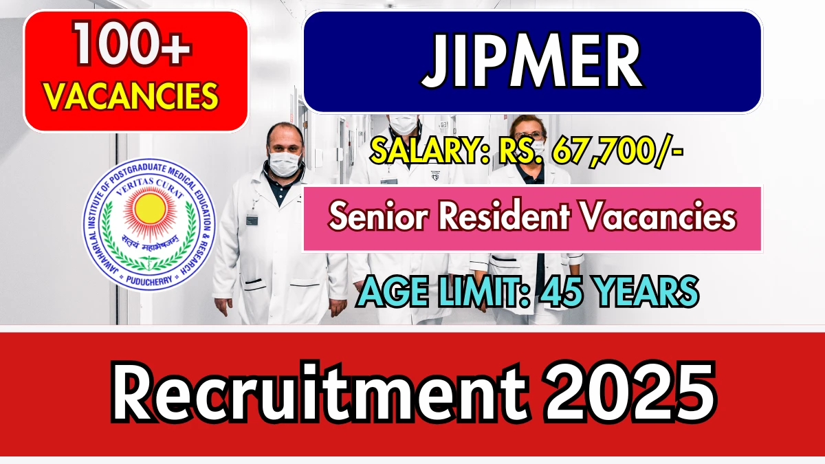 Jawaharlal Institute of Postgraduate Medical Education and Research (JIPMER) has released an official notification for the recruitment of 118 Senior Resident Posts. Interested and eligible candidates can apply Online through the official JIPMER website. The last date to submit the application form is 03-11-2025. In this article, you’ll find the JIPMER Senior Resident Posts recruitment details, including eligibility criteria, age limit, salary structure, selection process, application steps, and direct links to the official notification and Online application form.