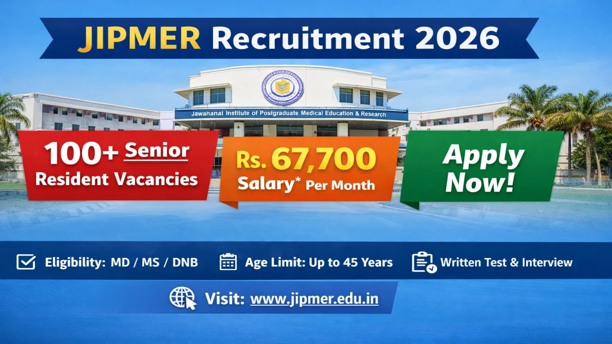 Jawaharlal Institute of Postgraduate Medical Education and Research (JIPMER) has released an official notification for the recruitment of 110 Senior Resident Posts. Interested and eligible candidates can apply Online through the official JIPMER website. The last date to submit the application form is 03-02-2026. In this article, you’ll find the JIPMER Senior Resident Posts recruitment details, including eligibility criteria, age limit, salary structure, selection process, application steps, and direct links to the official notification and Online application form.