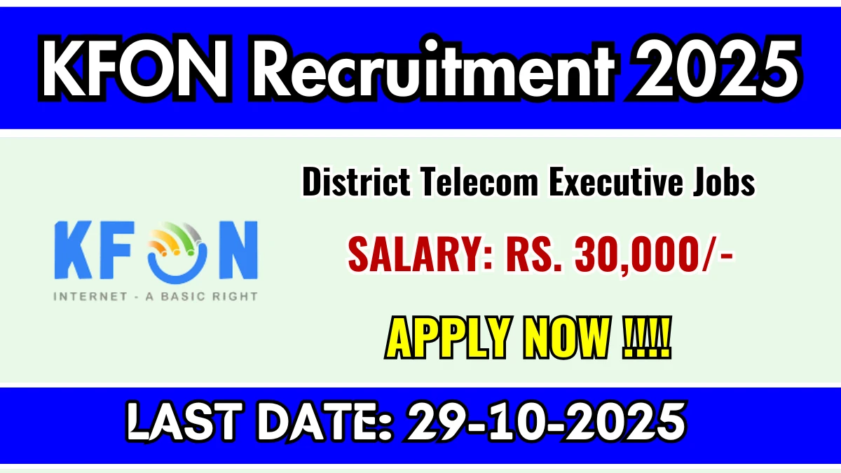 Kerala Fibre Optic Network (KFON) has released an official notification for the recruitment of 03 District Telecom Executive Posts. Interested and eligible candidates can apply Online through the official KFON website. The last date to submit the application form is 29-10-2025. In this article, you’ll find the KFON District Telecom Executive Posts recruitment details, including eligibility criteria, age limit, salary structure, selection process, application steps, and direct links to the official notification and Online application form.