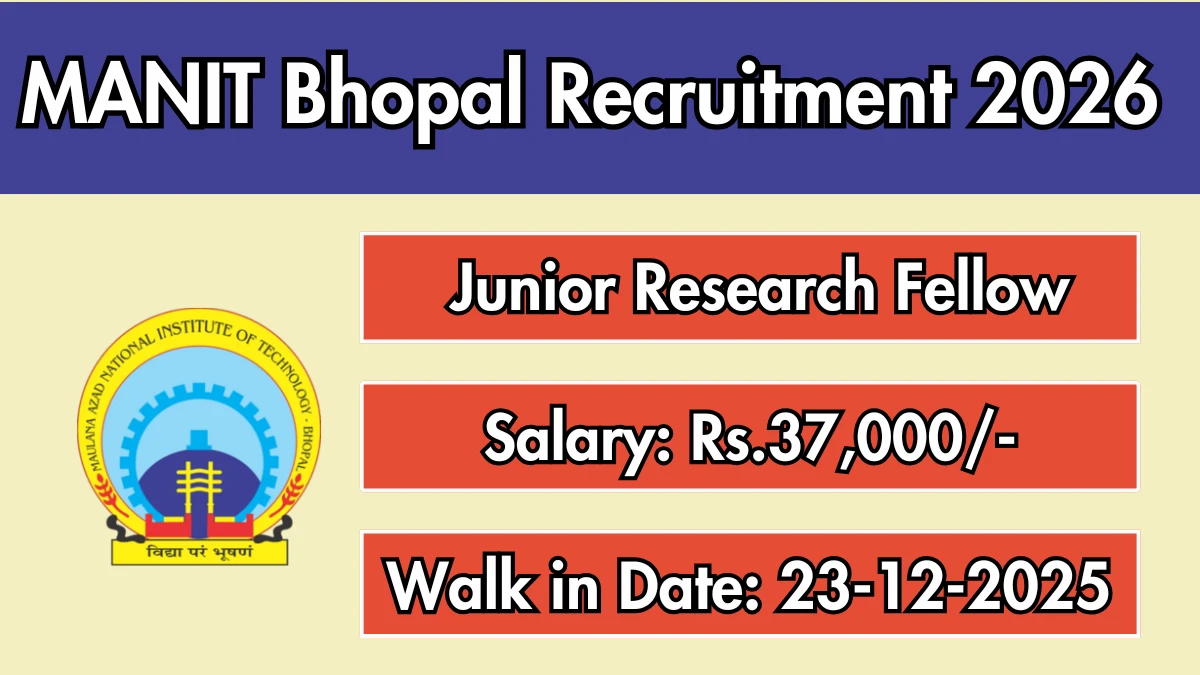 Maulana Azad National Institute of Technology (MANIT Bhopal) Recruitment 2025 for 01 posts of Junior Research Fellow. Candidates with B.Tech/B.E Can attend the walkin. The Walk-in on 23 December 2025. For detailed information please visit MANIT Bhopal official website, manit.ac.in.