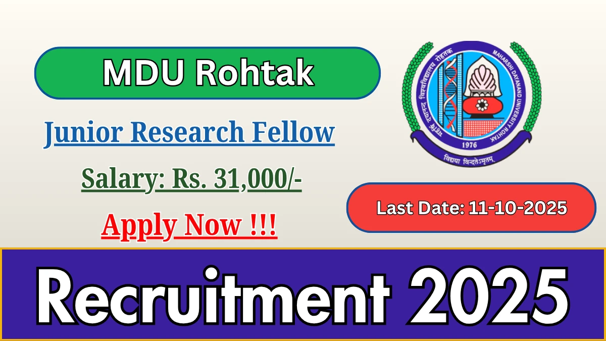 Maharshi Dayanand University (MDU Rohtak) has released an official notification for the recruitment of 01 Junior Research Fellow Posts. Interested and eligible candidates can apply Offline through the official MDU Rohtak website. The last date to submit the application form is 11-10-2025. In this article, you’ll find the MDU Rohtak Junior Research Fellow Posts recruitment details, including eligibility criteria, age limit, salary structure, selection process, application steps, and direct links to the official notification and Offline application form.