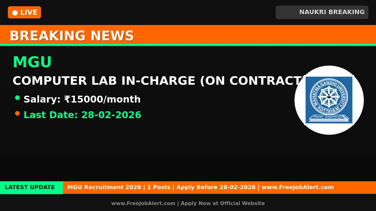 Mahatma Gandhi University (MGU) Recruitment 2026: Mahatma Gandhi University has released the official notification for 1 Computer Lab In-Charge (On Contract) posts, inviting applications from eligible candidates. This recruitment provides an excellent opportunity for candidates seeking education jobs.