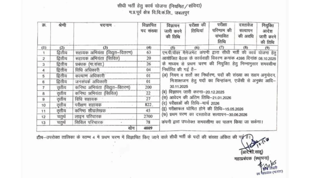 Madhya Pradesh Poorv Kshetra Vidyut Vitaran Company Ltd (MPPKVVCL) has announced the Recruitment 2025 for a wide range of positions, offering a total of 4009 vacancies. The recruitment includes posts such as Line Attendant, Junior Engineer, Assistant Engineer, Testing Assistant, Manager, Law Officer, and more. This is an excellent opportunity for candidates with various educational qualifications, from 10th and ITI to engineering and MBA degrees, to secure a government job in the power sector.