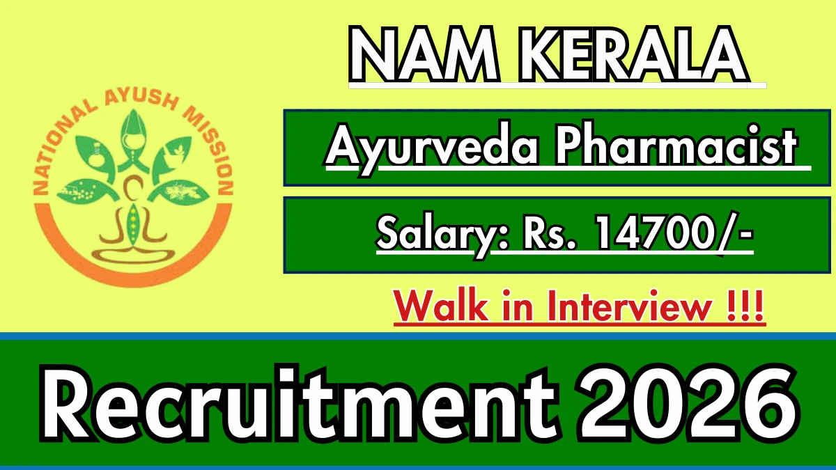 National AYUSH Mission Kerala (NAM Kerala) Recruitment 2026 for posts of Ayurveda Pharmacist. Candidates with D.Pharm Can attend the walkin. The Walk-in on 12-02-2026. For detailed information please visit NAM Kerala official website, nam.kerala.gov.in.