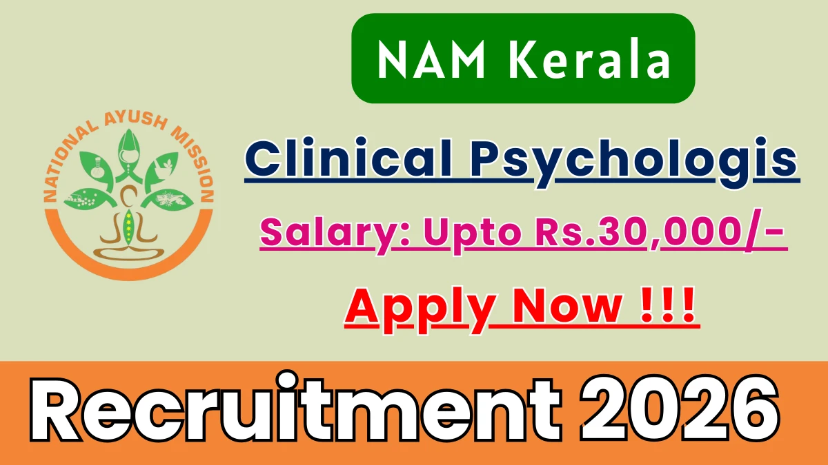National AYUSH Mission (NAM Kerala) has released an official notification for the recruitment of Clinical Psychologis Posts. Interested and eligible candidates can apply Offline through the official NAM Kerala website. The last date to submit the application form is 10-02-2026. In this article, you’ll find the NAM Kerala Clinical Psychologis Posts recruitment details, including eligibility criteria, age limit, salary structure, selection process, application steps, and direct links to the official notification and Offline application form.