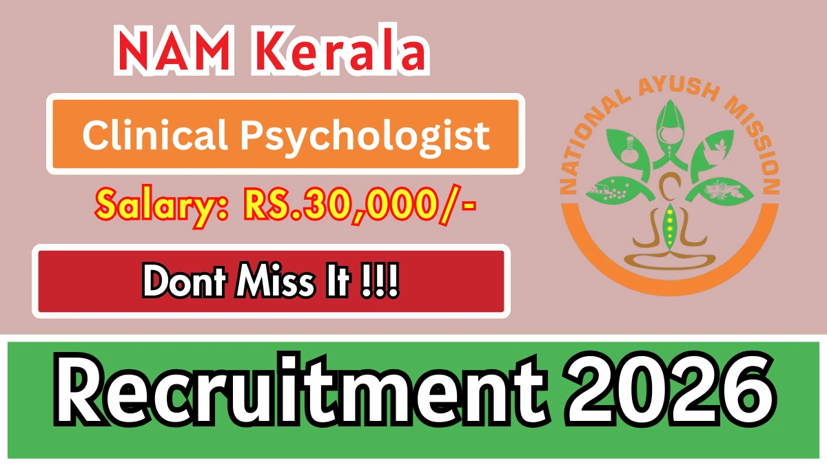 National AYUSH Mission Kerala (NAM Kerala) has released an official notification for the recruitment of Clinical Psychologist Posts. Interested and eligible candidates can apply Offline by sending the application form to the official address. The last date to submit the application is 28-02-2026.