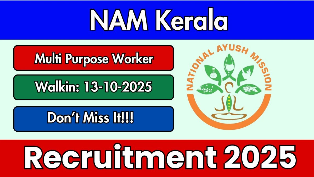 National Ayush Mission Kerala (NAM Kerala) Recruitment 2025 for posts of Multi Purpose Worker. Candidates with GNM Can attend the walkin. The Walk-in interview on 13-10-2025. For detailed information please visit NAM Kerala official website, nam.kerala.gov.in.