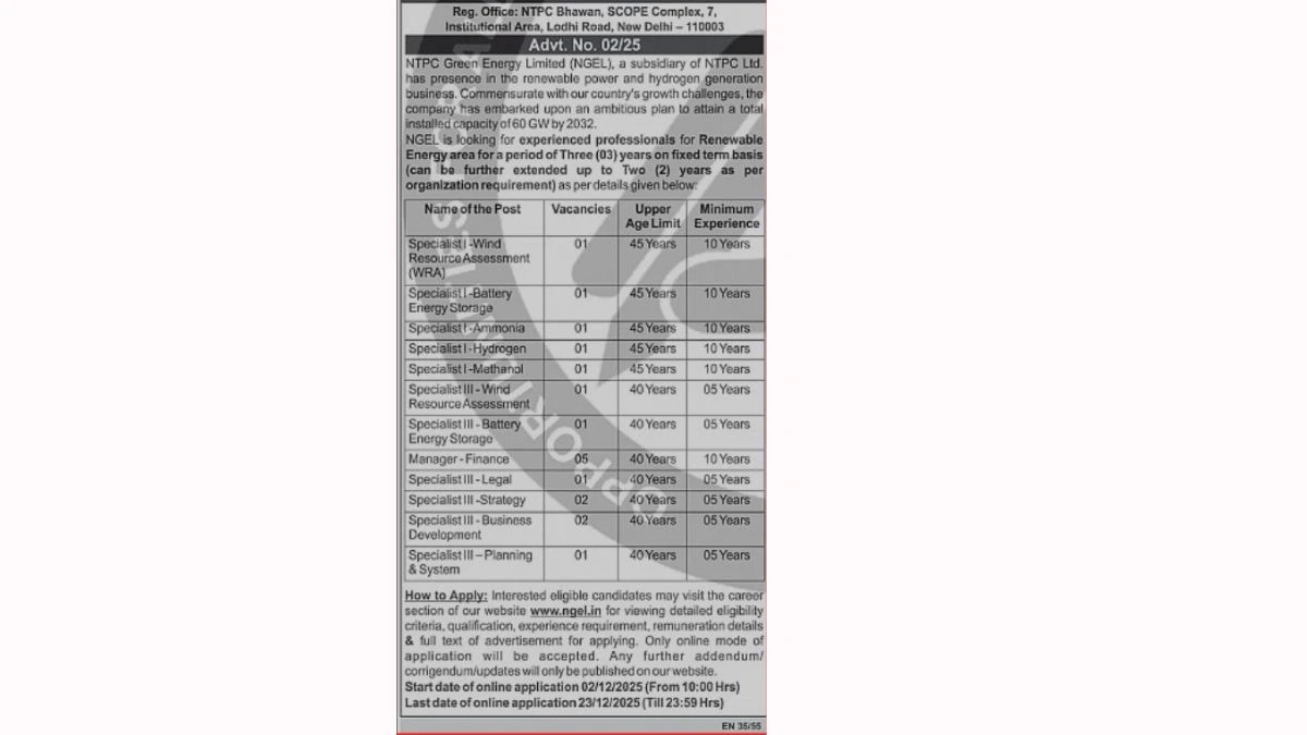 NTPC Green Energy (NGEL) has released an official notification for the recruitment of 18 Specialist, Manager and Other Posts. Interested and eligible candidates can apply Online through the official NGEL website. The last date to submit the application form is 23-12-2025. In this article, you’ll find the NGEL Specialist, Manager and Other Posts recruitment details, including eligibility criteria, age limit, salary structure, selection process, application steps, and direct links to the official notification and Online application form.