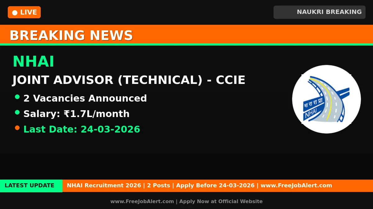 National Highways Authority of India (Ministry of Road Transport & Highways) (NHAI) has released an official notification for the recruitment of 2 Joint Advisor (Technical) - CCIE Posts. Interested and eligible candidates can apply Online through the official NHAI website. The last date to submit the application form is 24-03-2026.