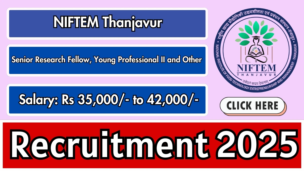 National Institute of Food Technology Entrepreneurship and Management Thanjavur (NIFTEM Thanjavur) Recruitment 2025 for 11 posts of Senior Research Fellow, Young Professional II and Other. Candidates with M.Sc, M.E/M.Tech, M.Phil/Ph.D Can attend the walkin. The Walk-in ends on 10-10-2025. For detailed information please visit NIFTEM Thanjavur official website, niftem-t.ac.in.