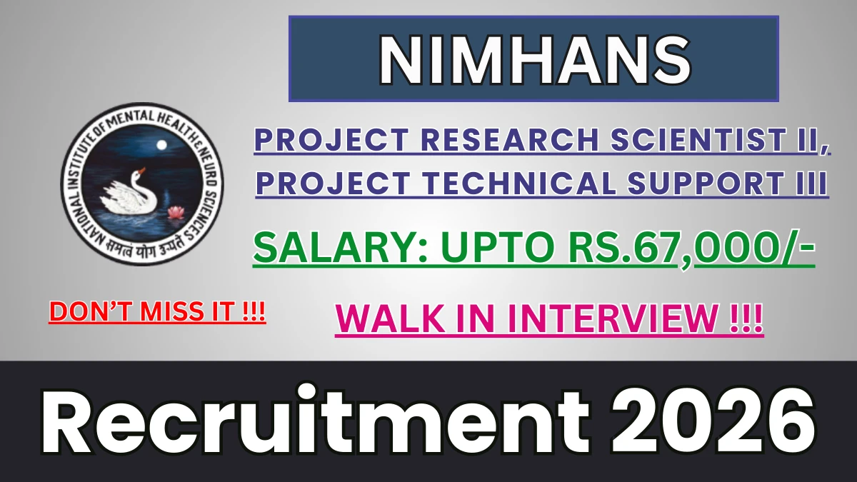 National Institute of Mental Health and Neuro Sciences (NIMHANS) Recruitment 2026 for 01 posts of Project Research Scientist II, Project Technical Support III. Candidates with Any Graduate, Any Post Graduate, M.Phil/Ph.D Can attend the walkin. The Walk-in on 18-02-2026. For detailed information please visit NIMHANS official website, https://www.nimhans.ac.in.