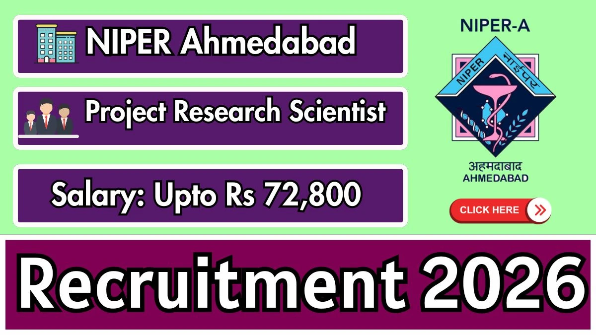 National Institute Of Pharmaceutical Education and Research (NIPER Ahmedabad) has released an official notification for the recruitment of 01 Project Research Scientist Posts. Interested and eligible candidates can apply Online through the official NIPER Ahmedabad website. The last date to submit the application form is 23-02-2026. In this article, you’ll find the NIPER Ahmedabad Project Research Scientist Posts recruitment details, including eligibility criteria, age limit, salary structure, selection process, application steps, and direct links to the official notification and Online application form.