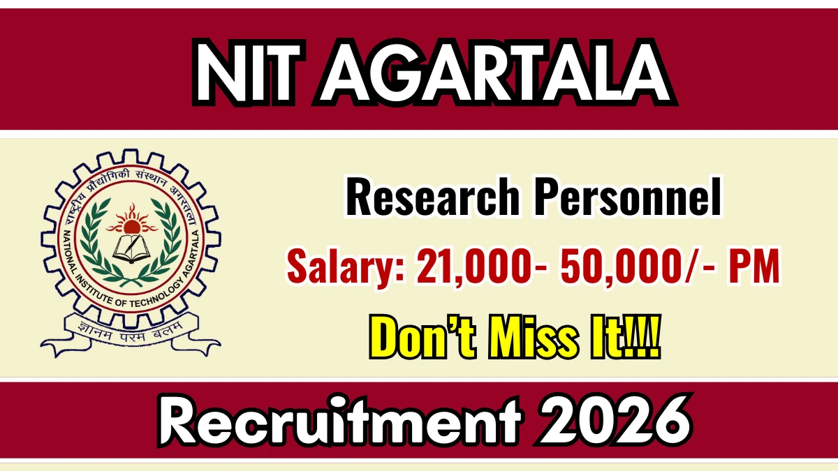 National Institute of Technology Agartala (NIT Agartala) has released an official notification for the recruitment Research Personnel Posts. Interested and eligible candidates can apply Online through the official NIT Agartala website. The last date to submit the application form is 07-02-2026. In this article, you’ll find the NIT Agartala Research Personnel Posts recruitment details, including eligibility criteria, age limit, salary structure, selection process, application steps, and direct links to the official notification and Online application form.
