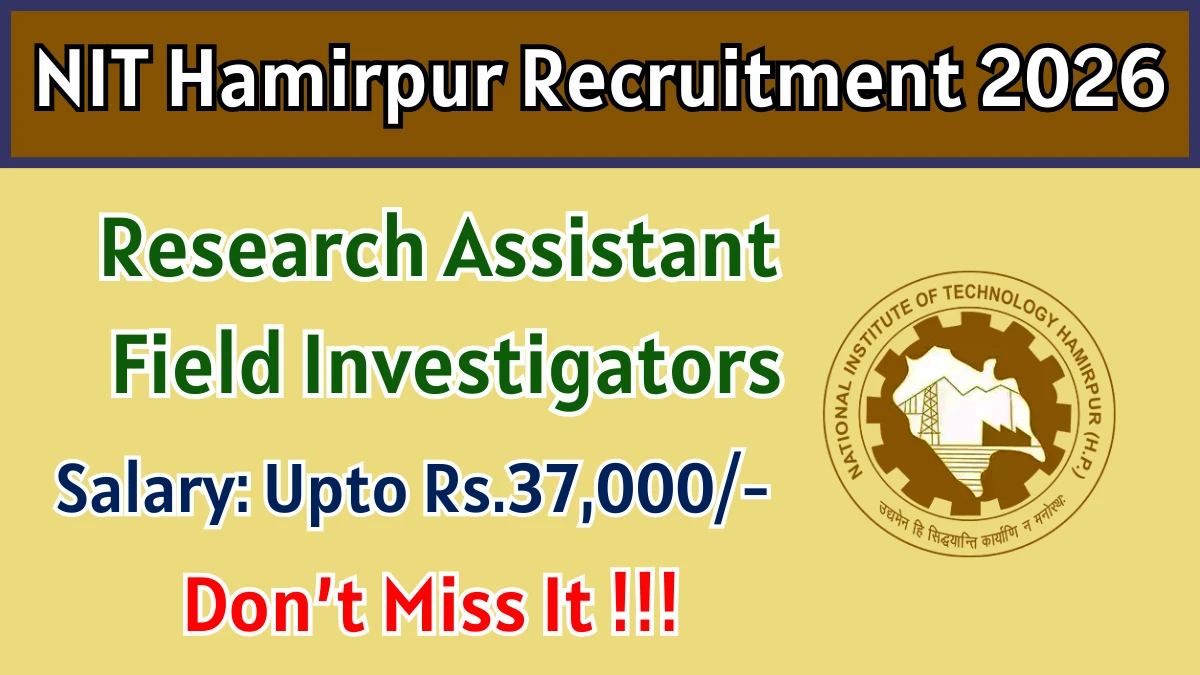 The National Institute of Technology Hamirpur (NIT Hamirpur) Recruitment 2026 for posts of 03 Research Assistant and Field Investigators. Candidates with M.A, M.Phil/Ph.D Can Apply Offline. The Offline application opens on 09-01-2026, and closes on 23-01-2026. The candidate shall apply Offline through NIT Hamirpur website, nith.ac.in.