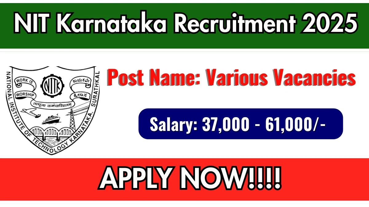 National Institute of Technology Karnataka (NIT Karnataka) has released an official notification for the recruitment of 02 Junior Research Fellow, Research Associate Posts. Interested and eligible candidates can apply Offline through the official NIT Karnataka website. The last date to submit the application form is 20-10-2025. In this article, you’ll find the NIT Karnataka Junior Research Fellow, Research Associate Posts recruitment details, including eligibility criteria, age limit, salary structure, selection process, application steps, and direct links to the official notification and Offline application form.