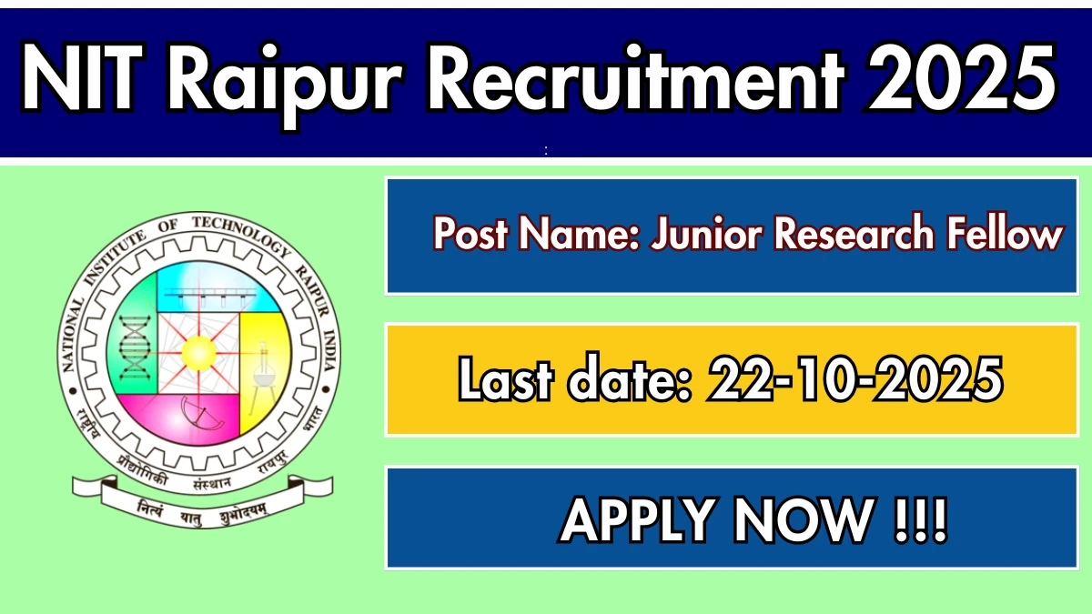 National Institute of Technology Raipur (NIT Raipur) has released an official notification for the recruitment of 01 Junior Research Fellow Posts. Interested and eligible candidates can apply Offline through the official NIT Raipur website. The last date to submit the application form is 22-10-2025. In this article, you’ll find the NIT Raipur Junior Research Fellow Posts recruitment details, including eligibility criteria, age limit, salary structure, selection process, application steps, and direct links to the official notification and Offline application form.