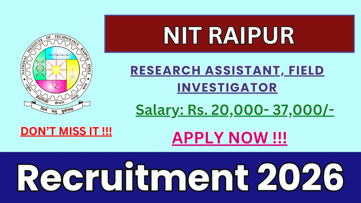 National Institute of Technology Raipur (NIT Raipur) has released an official notification for the recruitment of 04 Research Assistant, Field Investigator Posts. Interested and eligible candidates can apply Online through the official NIT Raipur website. The last date to submit the application form is 13-02-2026. In this article, you’ll find the NIT Raipur Research Assistant, Field Investigator Posts recruitment details, including eligibility criteria, age limit, salary structure, selection process, application steps, and direct links to the official notification and Online application form.