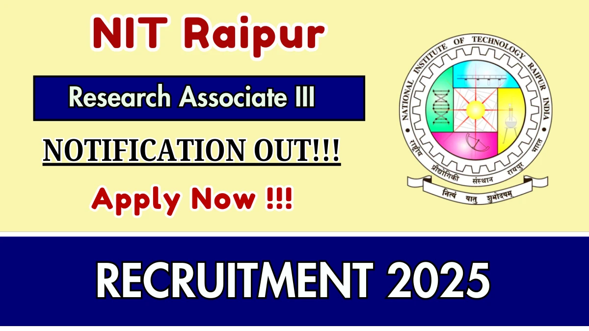 National Institute of Technology Raipur (NIT Raipur) has released an official notification for the recruitment of 01 Research Associate III Posts. Interested and eligible candidates can apply Online through the official NIT Raipur website. The last date to submit the application form is 07-01-2026. In this article, you’ll find the NIT Raipur Research Associate III Posts recruitment details, including eligibility criteria, age limit, salary structure, selection process, application steps, and direct links to the official notification and Online application form.