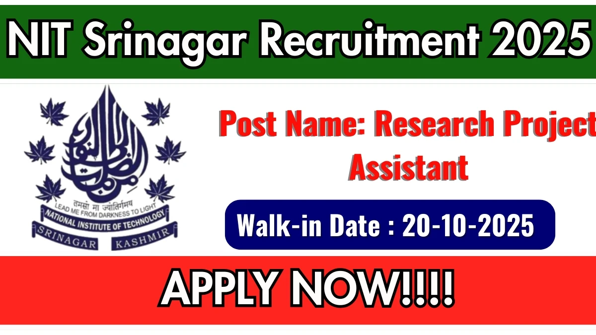 National Institute of Technology Srinagar (NIT Srinagar) Recruitment 2025 for 01 posts of Research Project Assistant. Candidates with B.Tech/B.E Can attend the walkin. The Walk-in on 20-10-2025. For detailed information please visit NIT Srinagar official website, nitsri.ac.in.