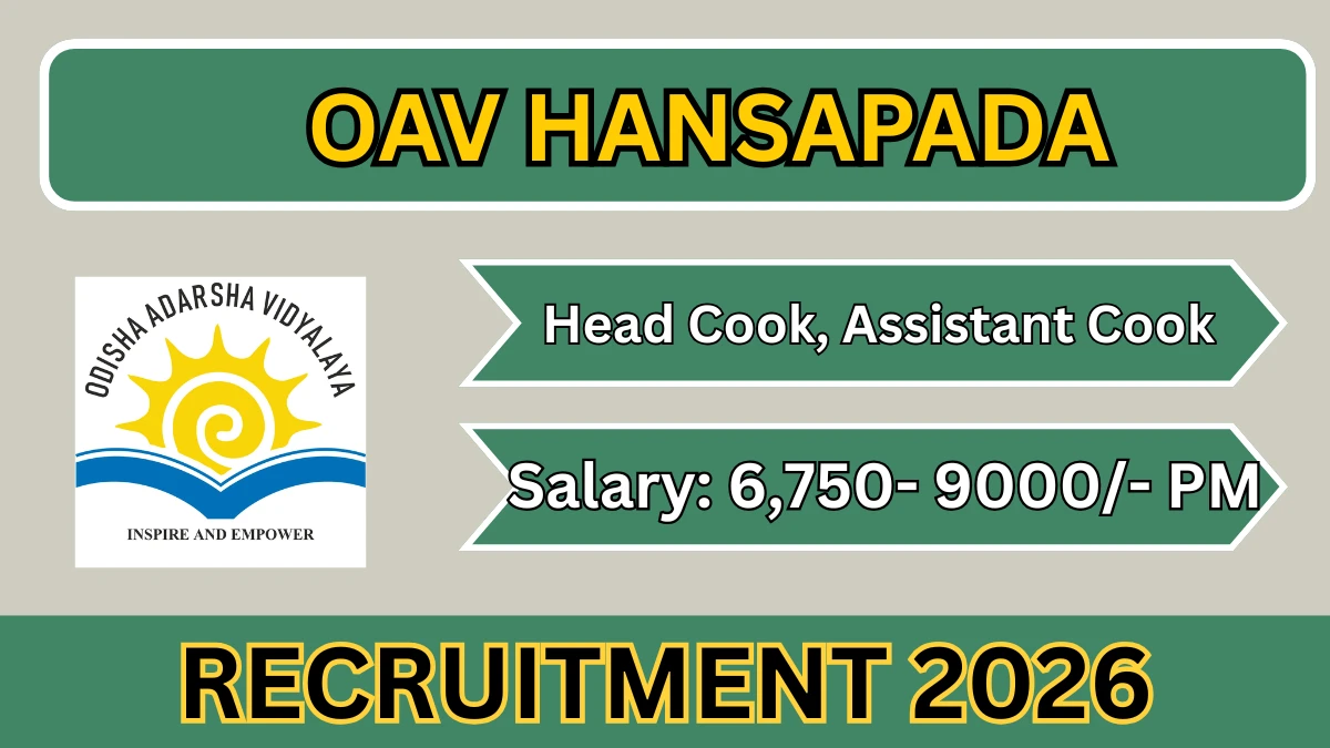 Odisha Adarsha Vidyalaya Hansapada (OAV Hansapada) Head Cook and Assistant Cook Notification 2026 has been released on 7 April 2026 on the official website puri.odisha.gov.in. A total of 3 vacancies have been announced through the OAV Hansapada Head Cook and Assistant Cook Recruitment 2026.