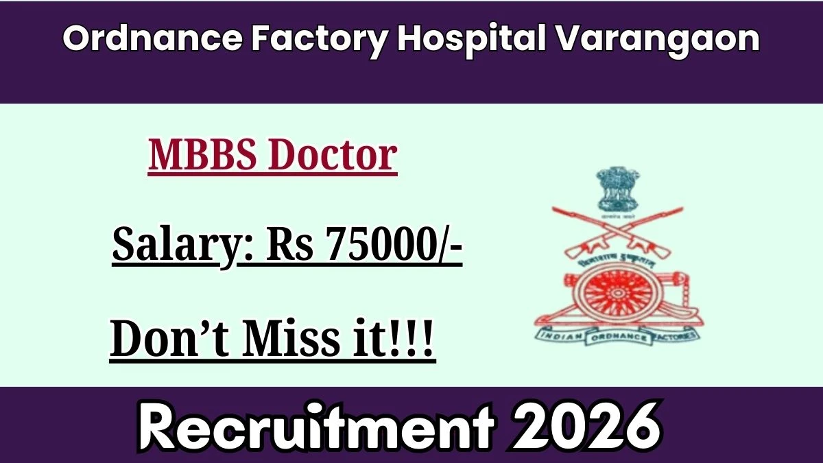 The Ordnance Factory Hospital, Varangaon (Maharashtra), under the Government of India, Ministry of Defence, has released a walk-in notification for the engagement of MBBS Doctors (HMP) on a contractual basis. A total of 2 vacancies are available for a period of 6 months, extendable by another term based on performance. Interested and eligible candidates can directly attend the walk-in interview on 30th January 2026 at the CMO I/C Office, Ordnance Factory Hospital Varangaon. Candidates are advised to check details regarding eligibility, age limit, salary, and required documents before attending the interview.