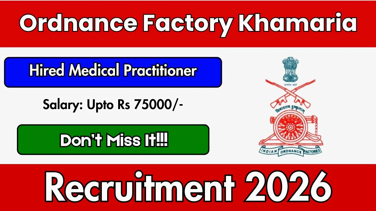 Ordnance Factory Khamaria Recruitment 2026 for 01 posts of Hired Medical Practitioner. Candidates with MBBS Can attend the walkin. The Walk-in interview on 12-01-2026. For detailed information please visit Ordnance Factory Khamaria official website, ddpdoo.gov.in.