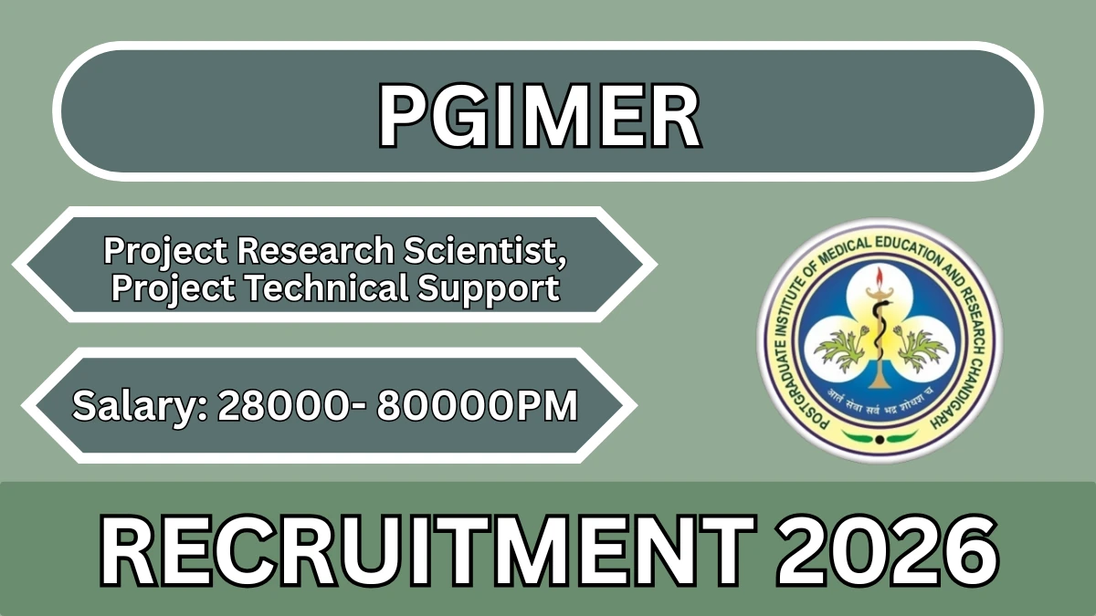 Postgraduate Institute of Medical Education and Research (PGIMER) Recruitment 2026 for 4 posts of Project Research Scientist, Project Technical Support. Candidates with B.A, B.Sc, M.A, M.Sc, Master of Dental Surgery Can attend the walkin. The Walk-in ends on 02-02-2026. For detailed information please visit PGIMER official website, https://pgimer.edu.in.