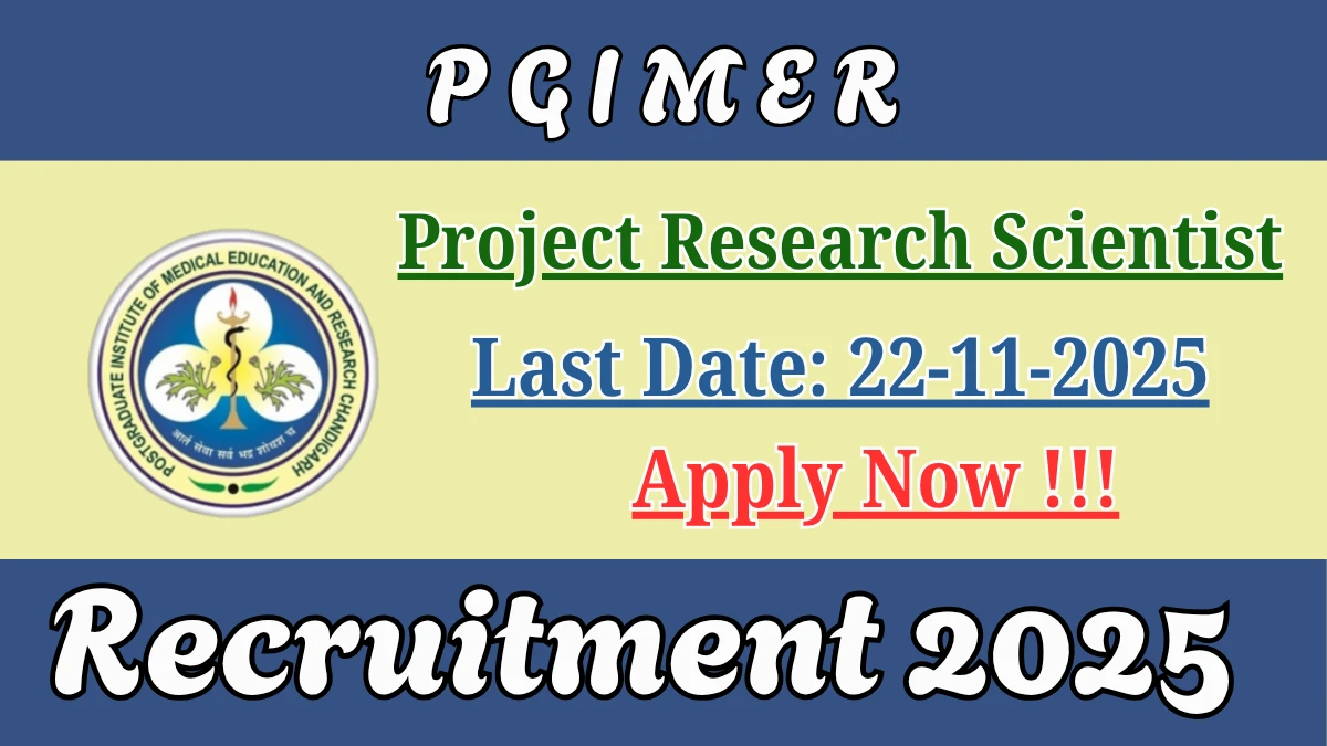 Postgraduate Institute of Medical Education and Research (PGIMER) has released an official notification for the recruitment of 02 Project Research Scientist Posts. Interested and eligible candidates can apply Offline through the official PGIMER website. The last date to submit the application form is 22-11-2025. In this article, you’ll find the PGIMER Project Research Scientist Posts recruitment details, including eligibility criteria, age limit, salary structure, selection process, application steps, and direct links to the official notification and Offline application form.