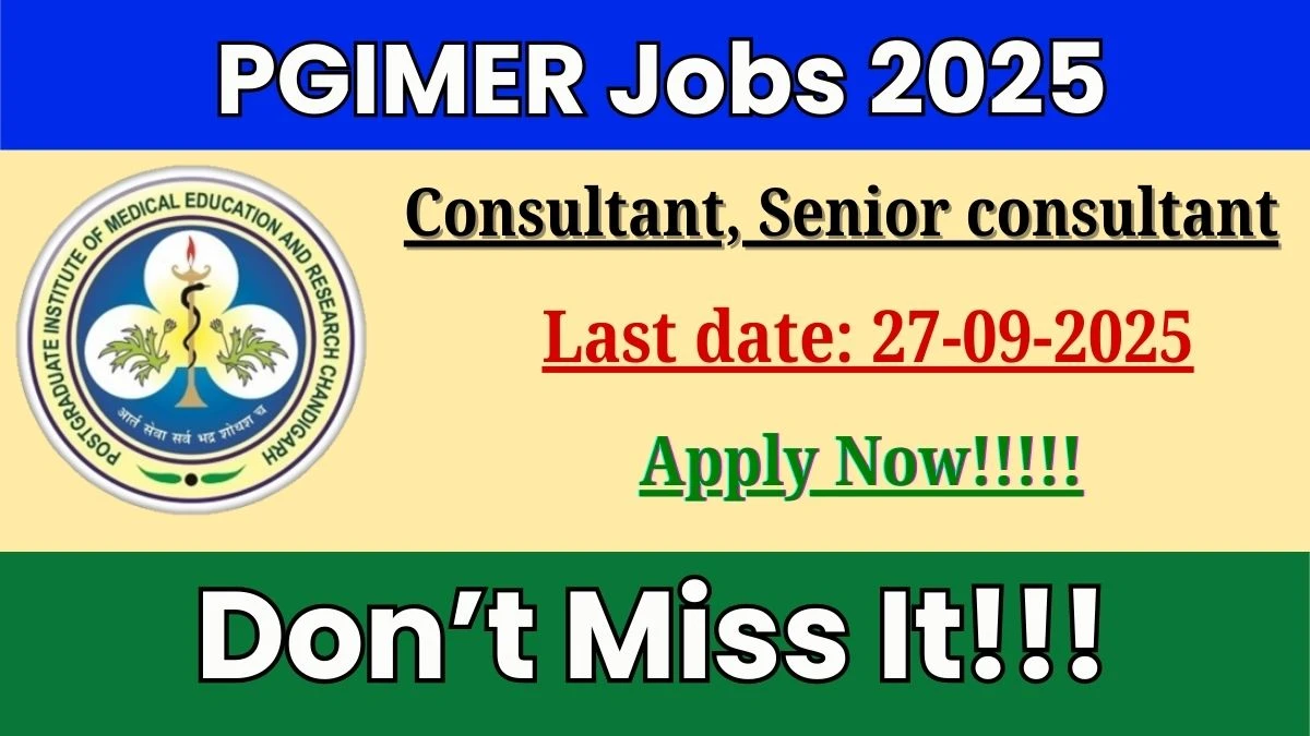The Postgraduate Institute of Medical Education and Research (PGIMER) Recruitment 2025 for 02 posts of Consultant, Senior consultant. Candidates with MS/MD Can Apply Offline. The Offline application opens on 19-09-2025, and closes on 27-09-2025. The candidate shall apply Offline through PGIMER website, pgimer.edu.in.
