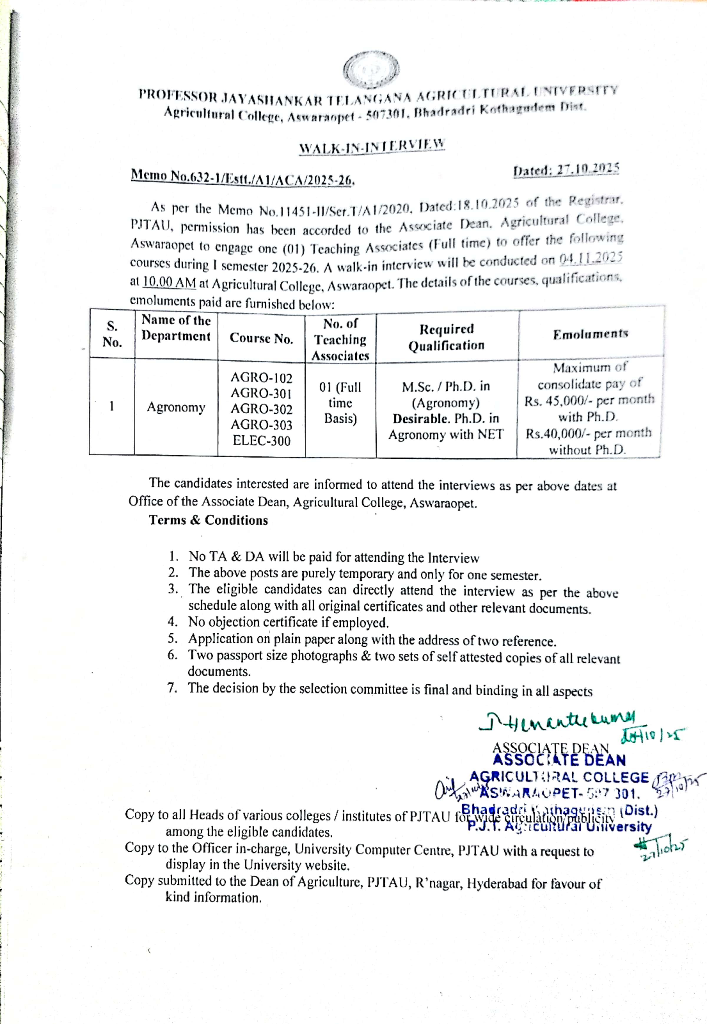 Name of the Post: PJTAU Teaching Associate Walk in 2025
